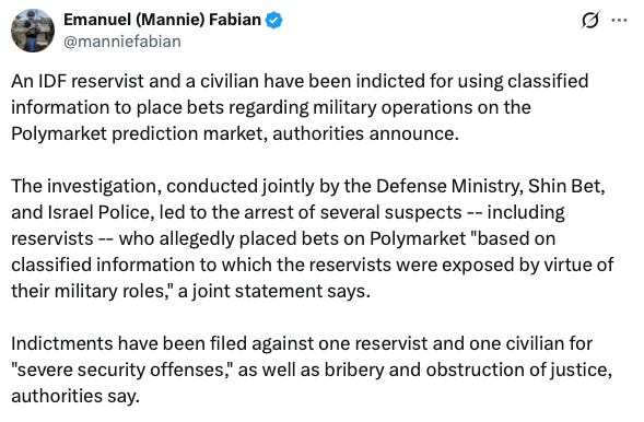 It seems almost inevitable to me that we’ll see more of this, and not just when it comes to soldiers. There’s so much money involved that just about everything is vulnerable to the influence of prediction markets. Intelligence officers, civil servants, politicians - you name it. It’s going to be like sports betting just that the stakes are much higher because it can literally be about life and death.