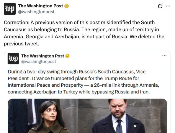 Over on Twitter, the Washington Post just issued an astonishing correction. I’ll present it below without comment, it’s really something: